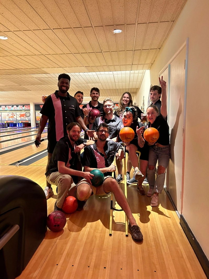 We love spectators. Come find us at Rowan's Bowling Alley on the first Thursday of every month for a fun-filled evening of slapping pins.